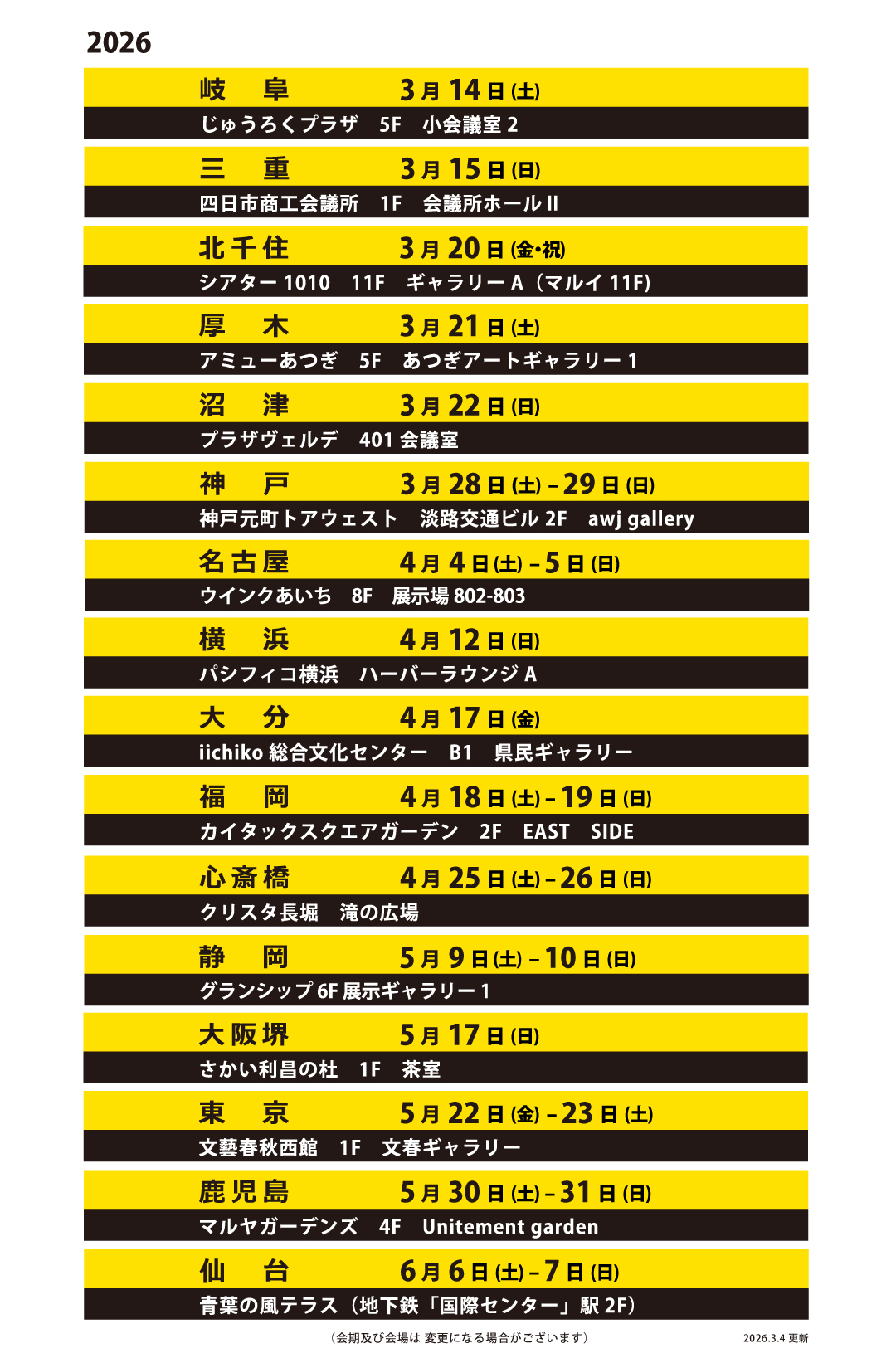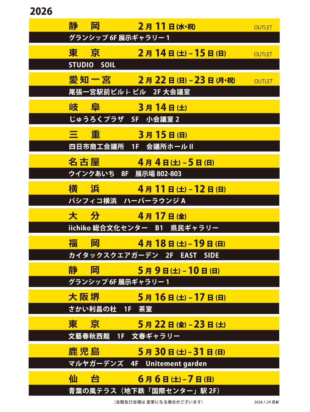 FACTORY JOURNAL シンクビー!サーカス 開催予定スケジュール 2023.12.25 2026年の開催予定を一覧にいたしましたので、ぜひご確認くださいませ♪ ※日時・場所は、現在の予定です。変更になる場合がございますので、予めご了承くださいませ。 PREV 記事一覧へ NEXT